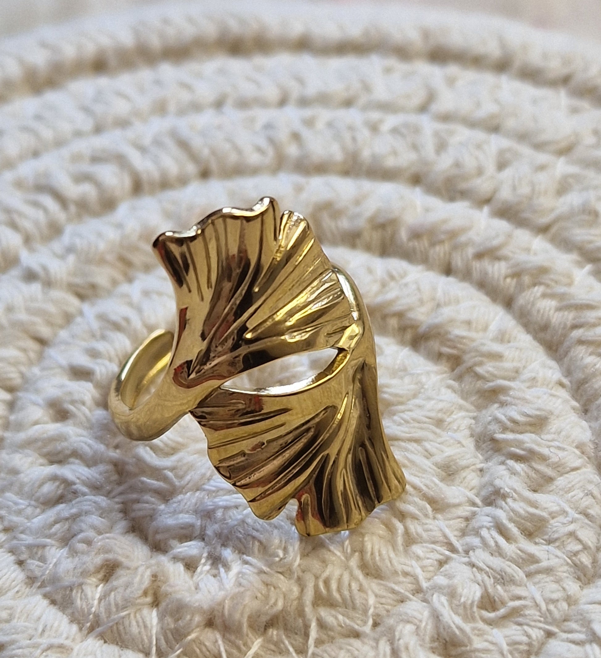 Bague en acier inoxydable doré au design plissé, rappelant un tissu drapé ou une feuille repliée. Un bijou chic et original.